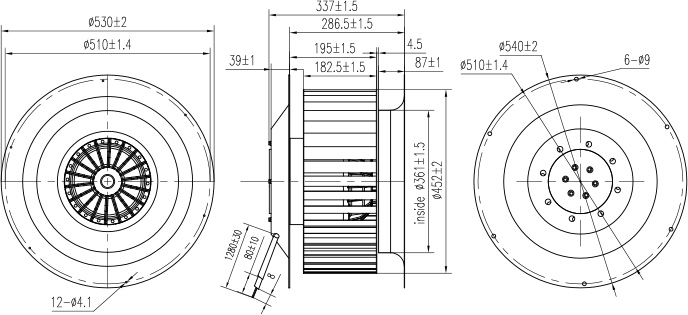 ②组成部件:高效外转子交流电机、镀锌钢板材质多翼前倾式离心叶轮、免维护深沟球滚珠轴承、静电粉末喷塑转子。