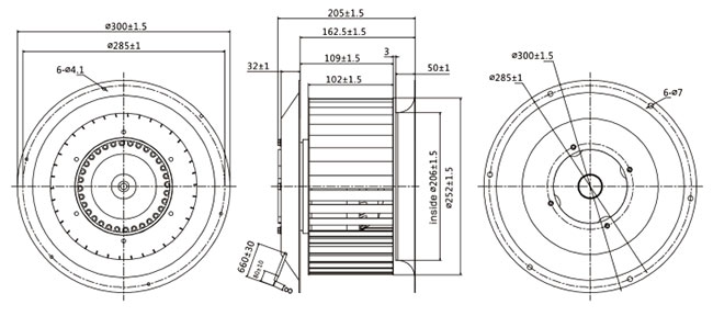 ②组成部件:高效外转子交流电机、镀锌钢板材质多翼前倾式离心叶轮、免维护深沟球滚珠轴承、静电粉末喷塑转子。