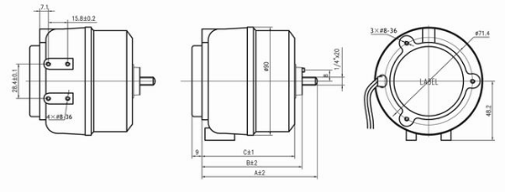 | 型号 | 额定电压 | 频率 | 输入功率 | 输出功率 | 额定电流 | 转速 | 转向 | A mm | B mm | C mm |